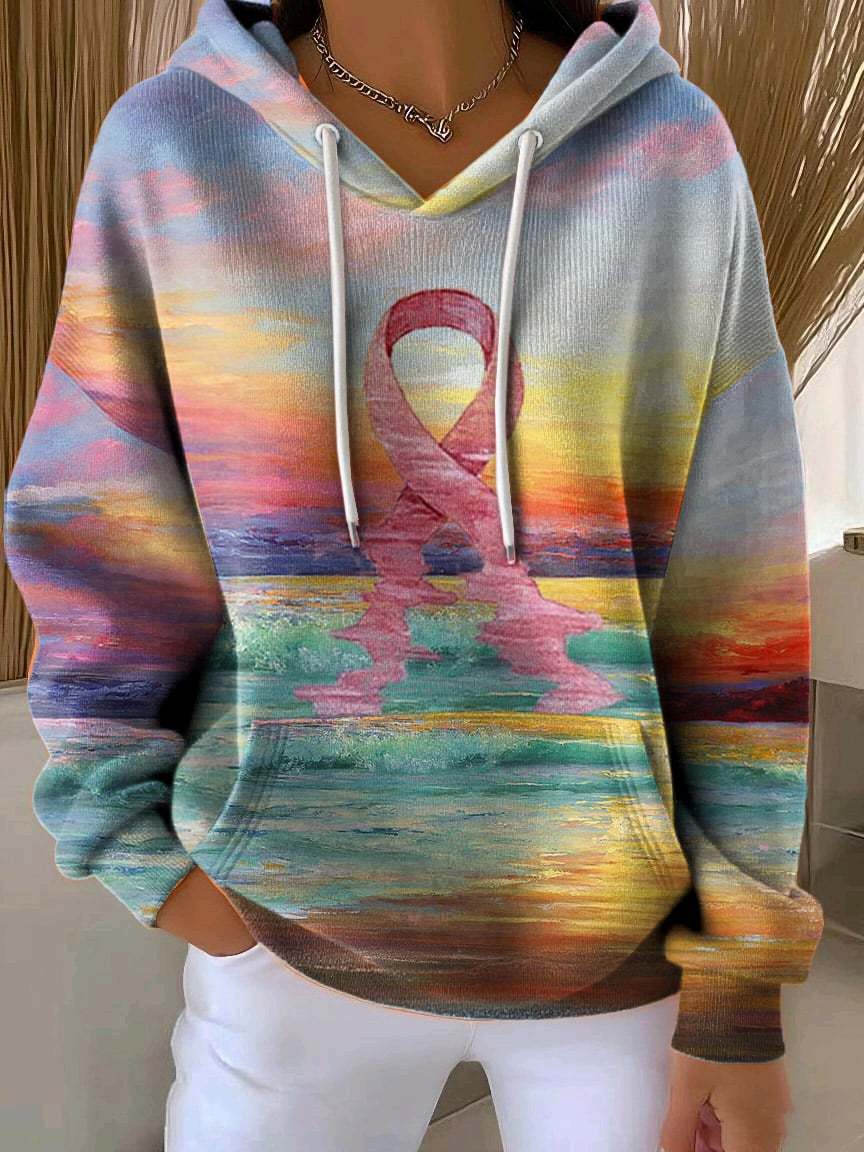 Women's Breast Cancer Awareness Print Ribbed Casual Hoodie