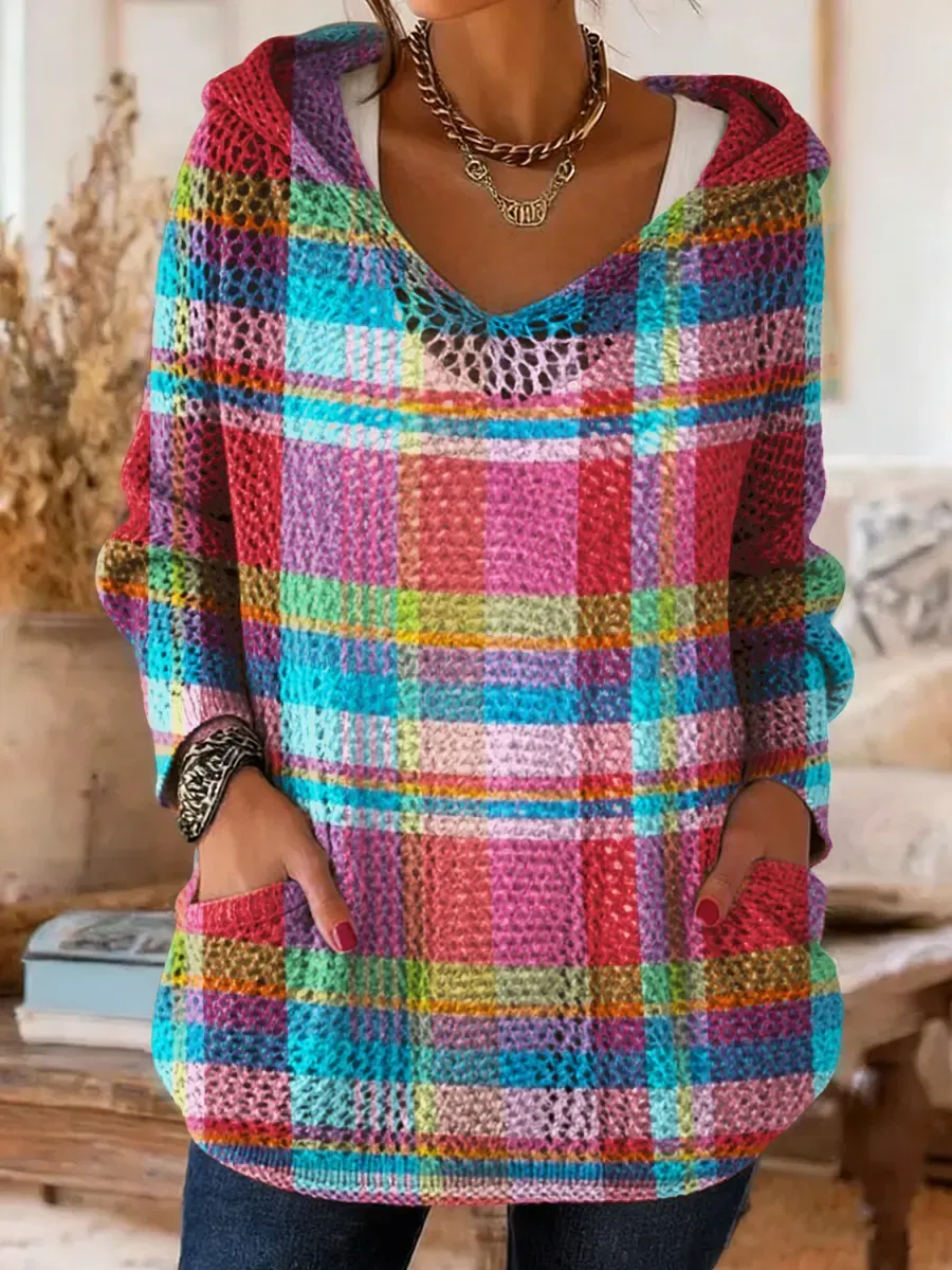 Women's Colorful Check Art Print Long-Sleeved Hooded Cover-Up
