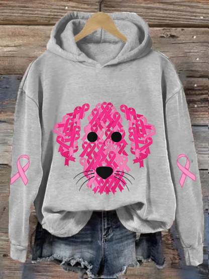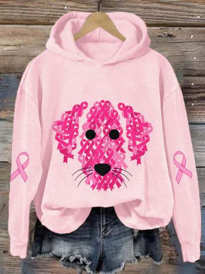 Women's Pink Ribbon Dog Breast Cancer Awareness Print Casual Hoodie