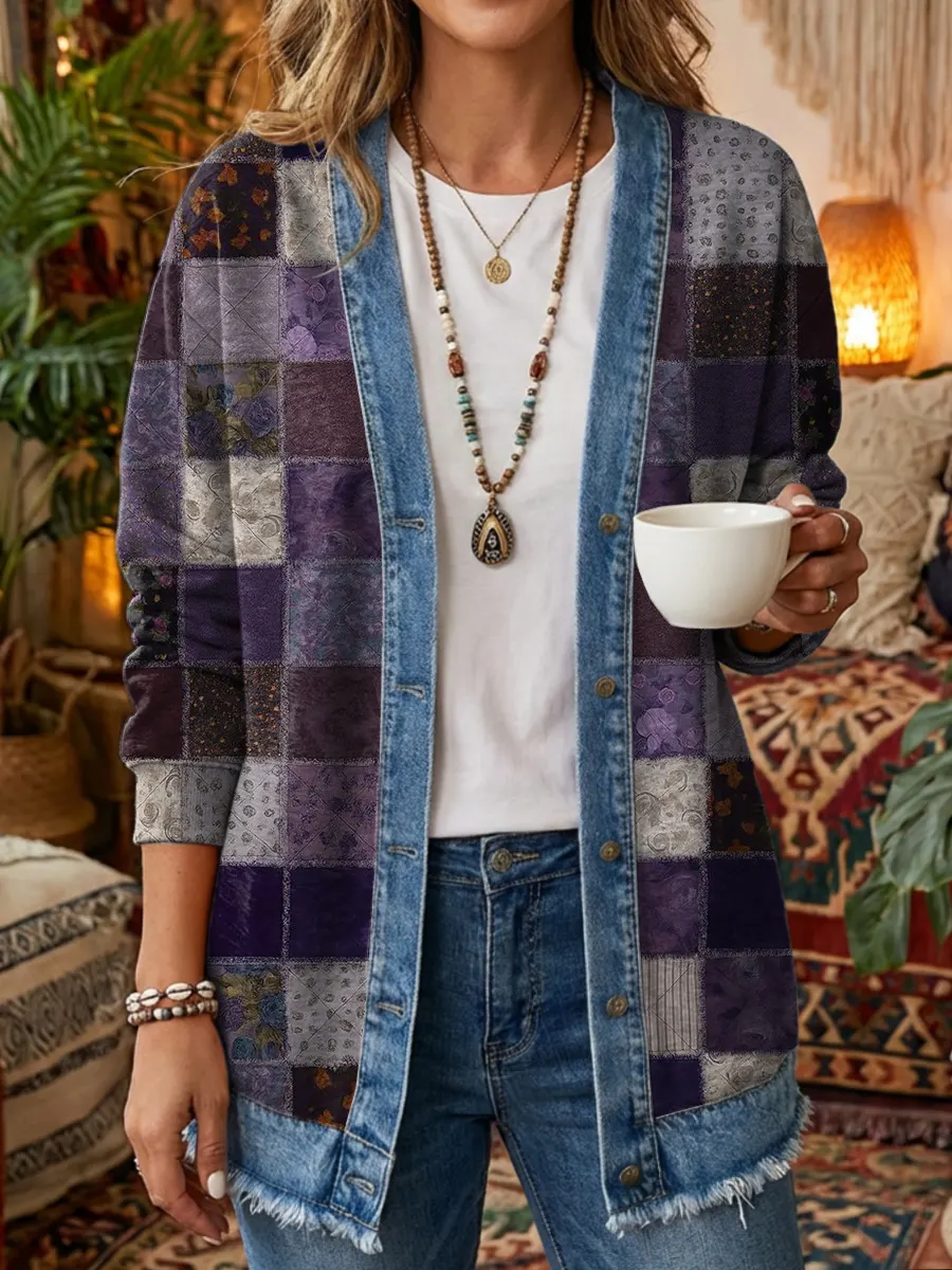 Ethnicity Retro Deep purple Flowers Women's Art Print Casual Long Sleeve Denim Patchwork Shirt Coat