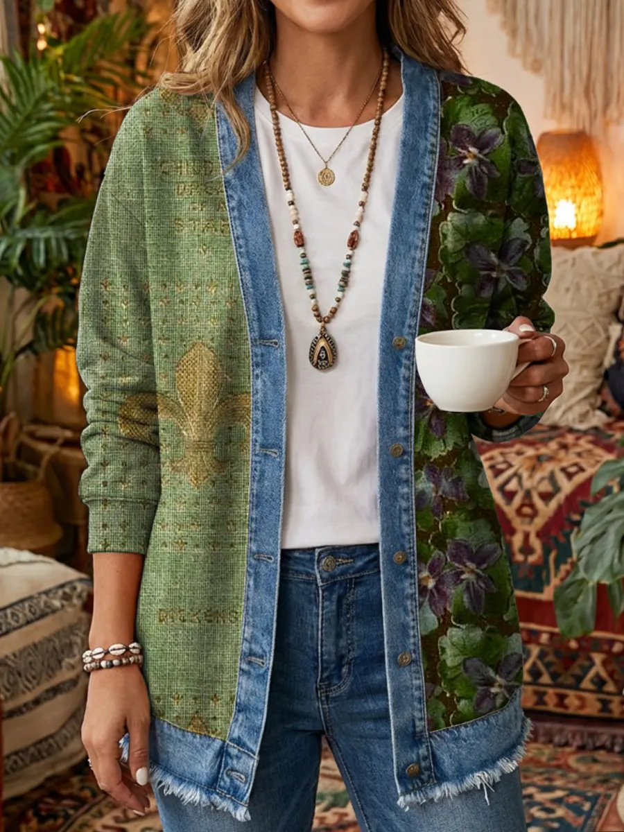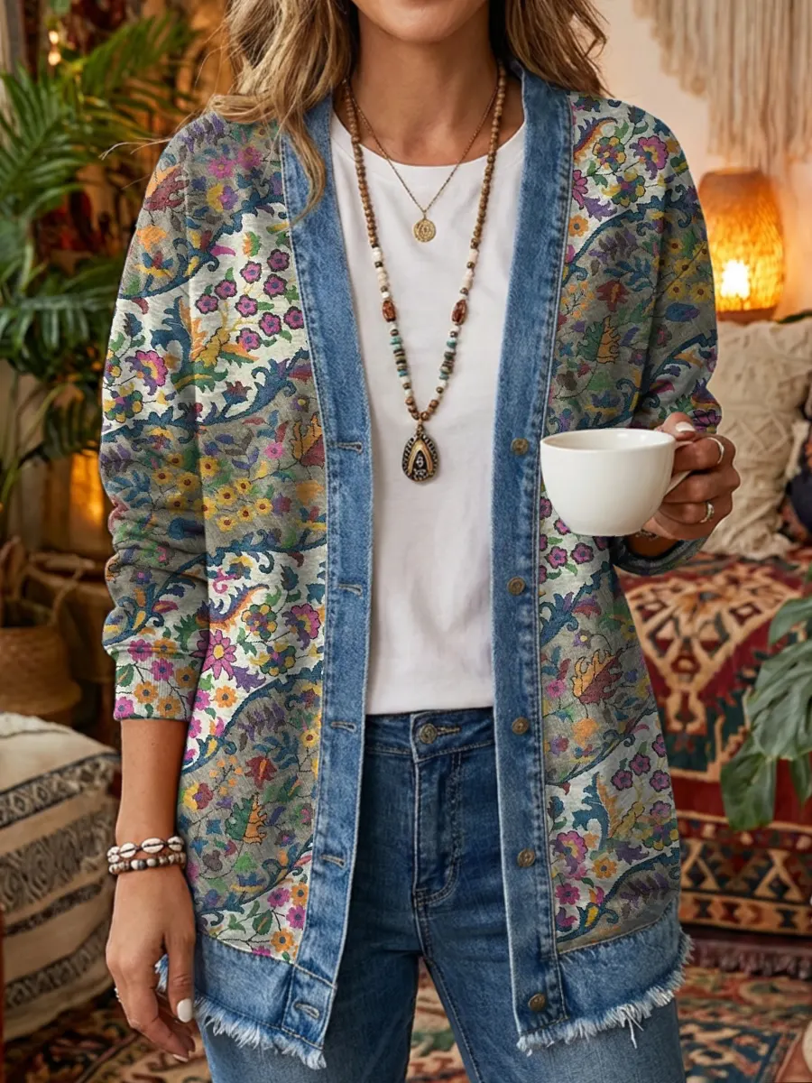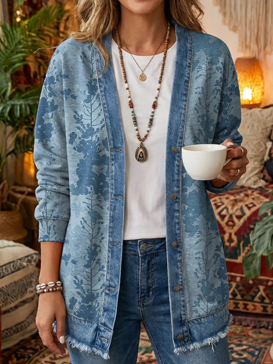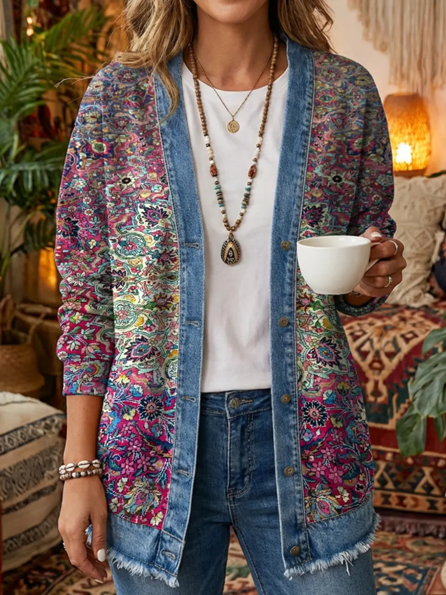 Women's Vintage Floral Art Print Casual Long Sleeve Denim Patchwork Shirt Coat