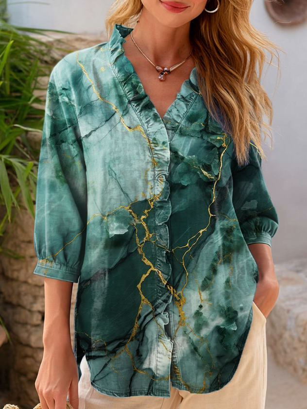 Women's Vintage Green Gradient Abstract Art Print Casual Ruffle Denim Cotton Shirt