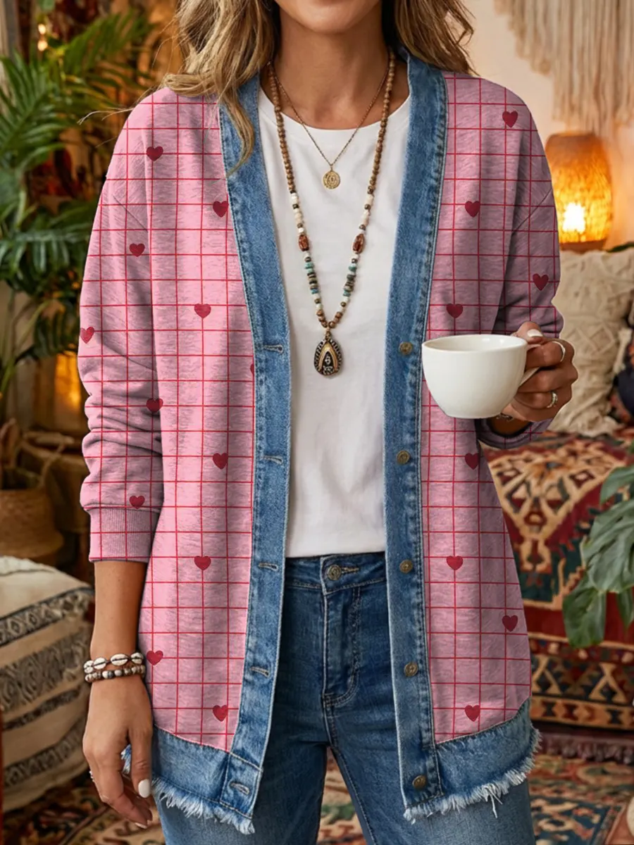 Women's Cute Heart Art Print Casual Long Sleeve Denim Patchwork Shirt Coat
