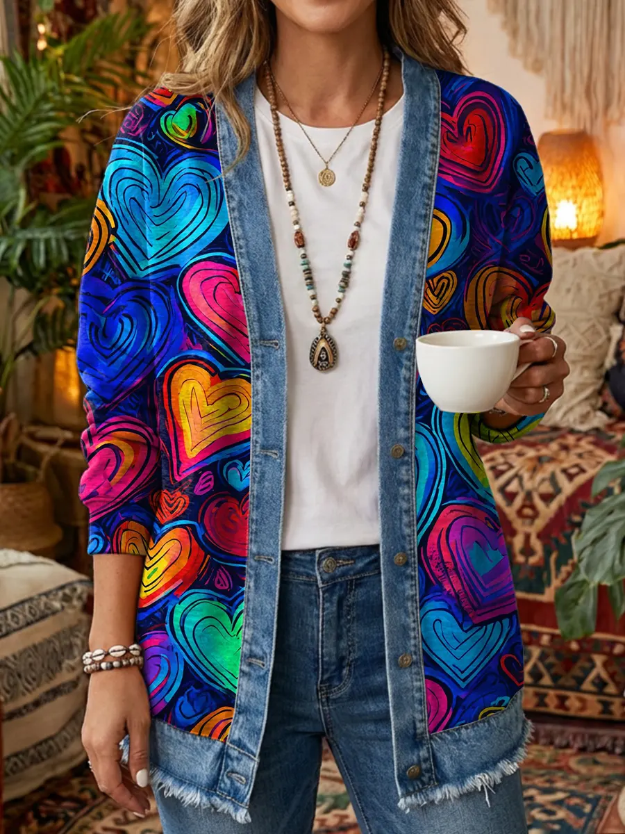 Ethnicity Colorful Abstract Love Women's Art Print Casual Long Sleeve Denim Patchwork Shirt Coat