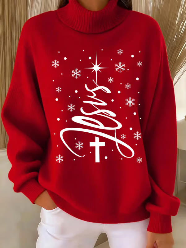 Christmas tree Faith Print Knit Turtleneck Pullover Sweater