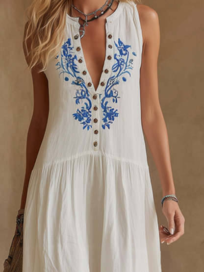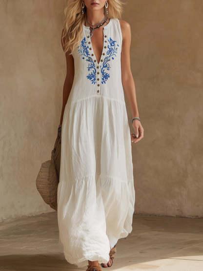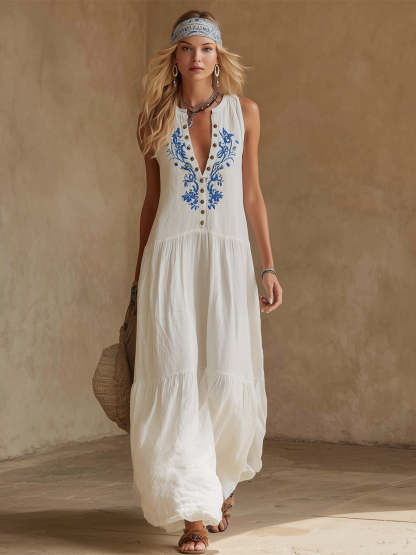Elegant And Casual Contrasting Color Long-sleeved White Cotton And Linen Sleeveless Maxi Dress