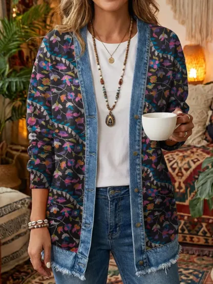 Ethnicity Flowers Purple Arc Women's Art Print Casual Long Sleeve Denim Patchwork Shirt Coat