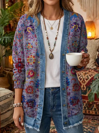 Ethnicity Flowers Purple Totem Women's Art Print Casual Long Sleeve Denim Patchwork Shirt Coat