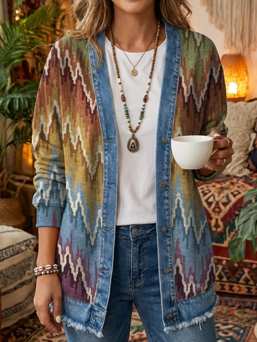 Ethnicity Geometry Colorful Women's Art Print Casual Long Sleeve Denim Patchwork Shirt Coat