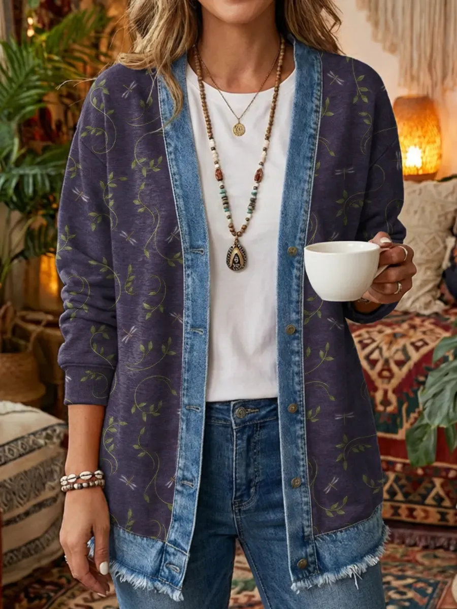 Ethnicity Leaves Purple Women's Art Print Casual Long Sleeve Denim Patchwork Shirt Coat