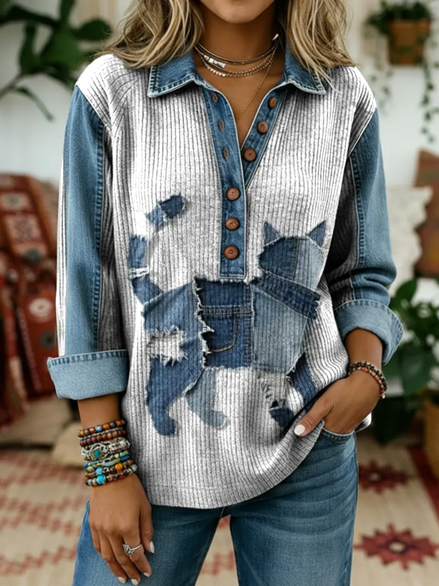 Ethnicity Patchwork Cat Women's Art Print Casual Denim Patchwork Shirt Coat
