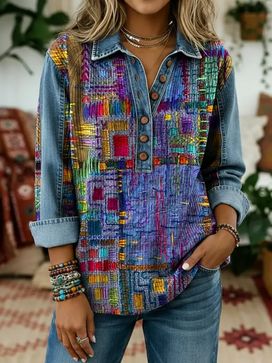 Ethnicity Texture Geometry Women's Art Print Casual Denim Patchwork Shirt Coat