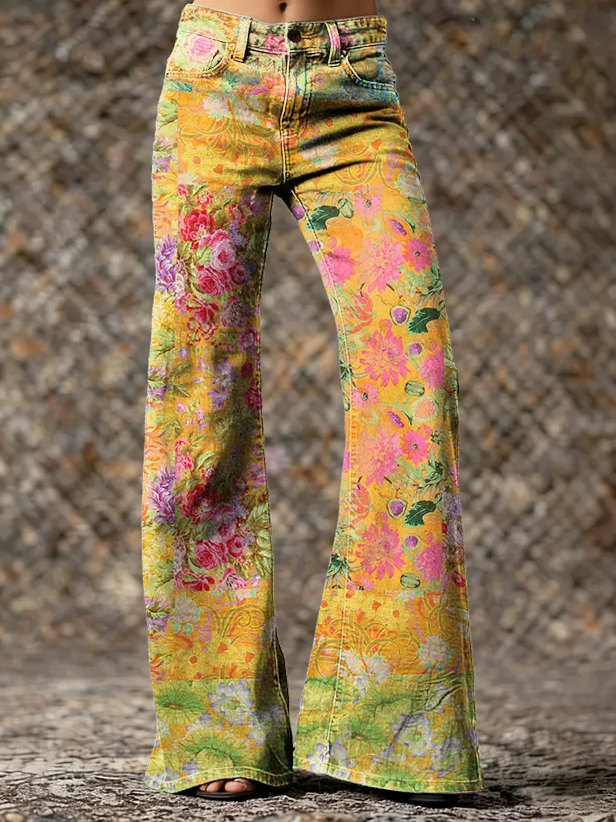 Women's Bohemian Floral Art Print Washed Denim Jeans
