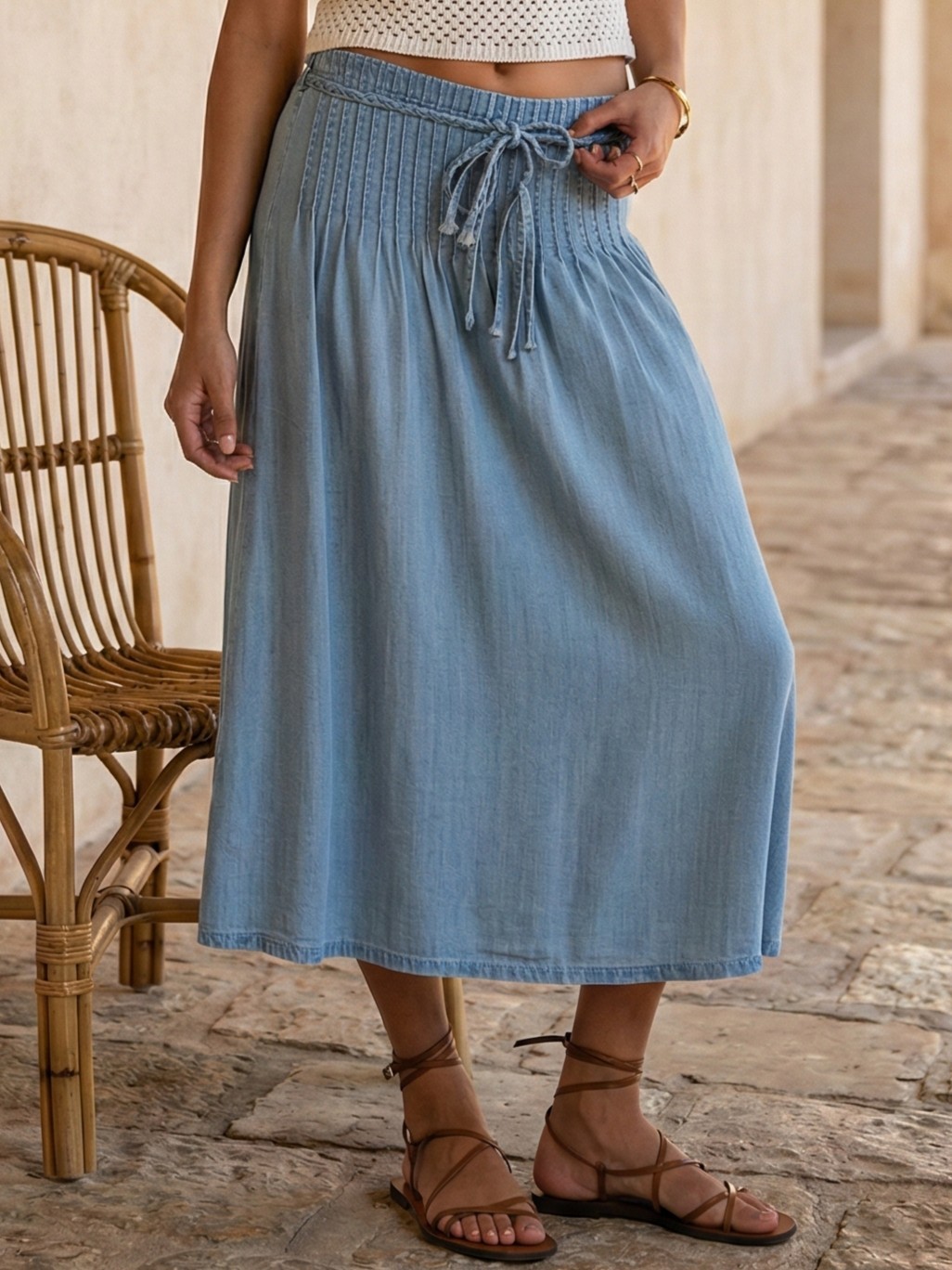 Women's Vintage Blue Pleated Casual Elastic Washed Denim Half Skirt