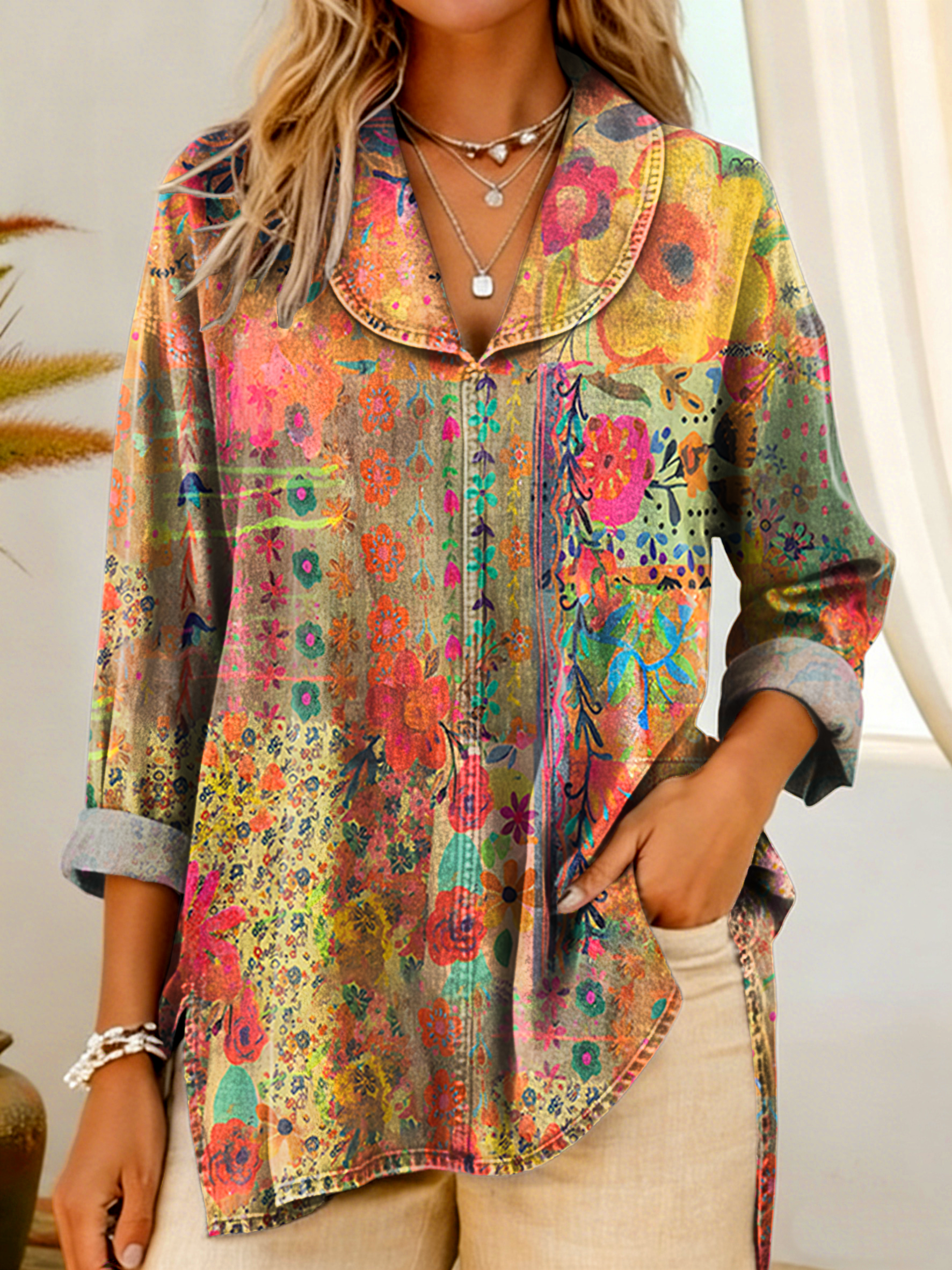 Women's Vintage Boho Floral Art Print Casual Flip Collar Long Sleeve Denim Cotton Shirt