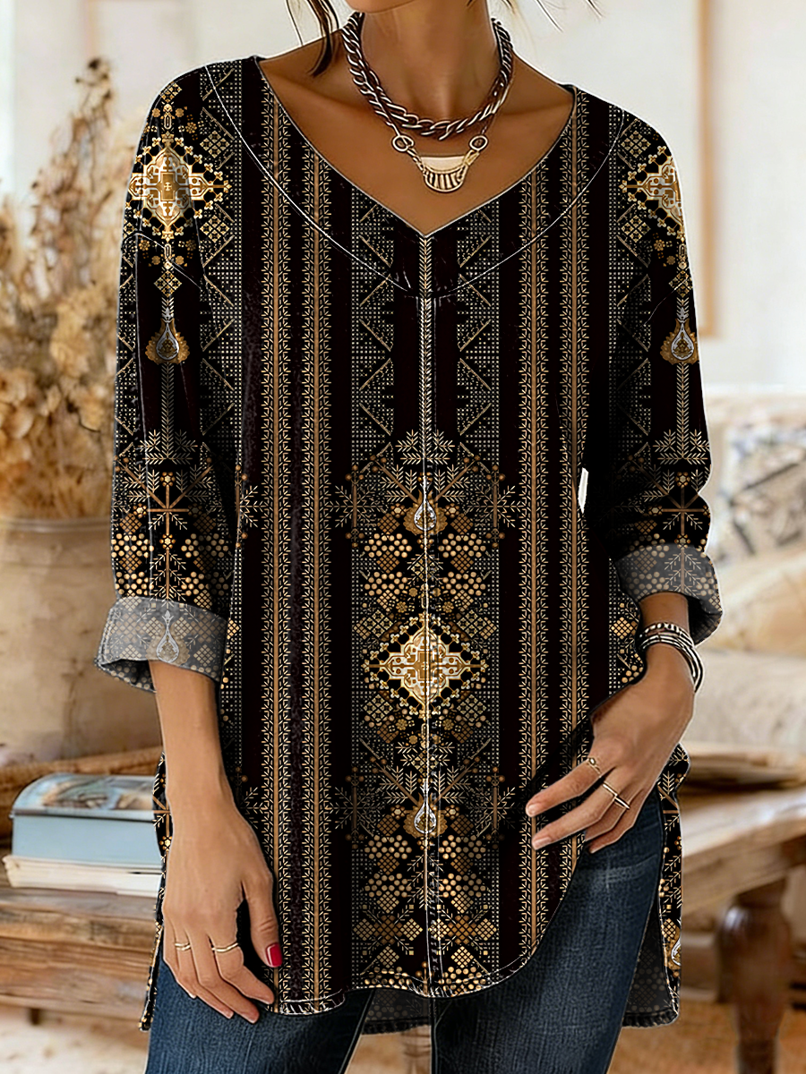 Women's Vintage Ethnic Black Geometric Totem Art Print Casual V-neck Denim Cotton Shirt
