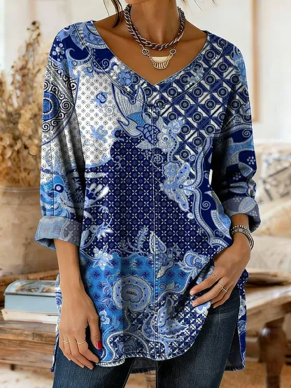 Women's Vintage Ethnic Blue Collage Floral Art Print Casual V-neck Denim Cotton Shirt