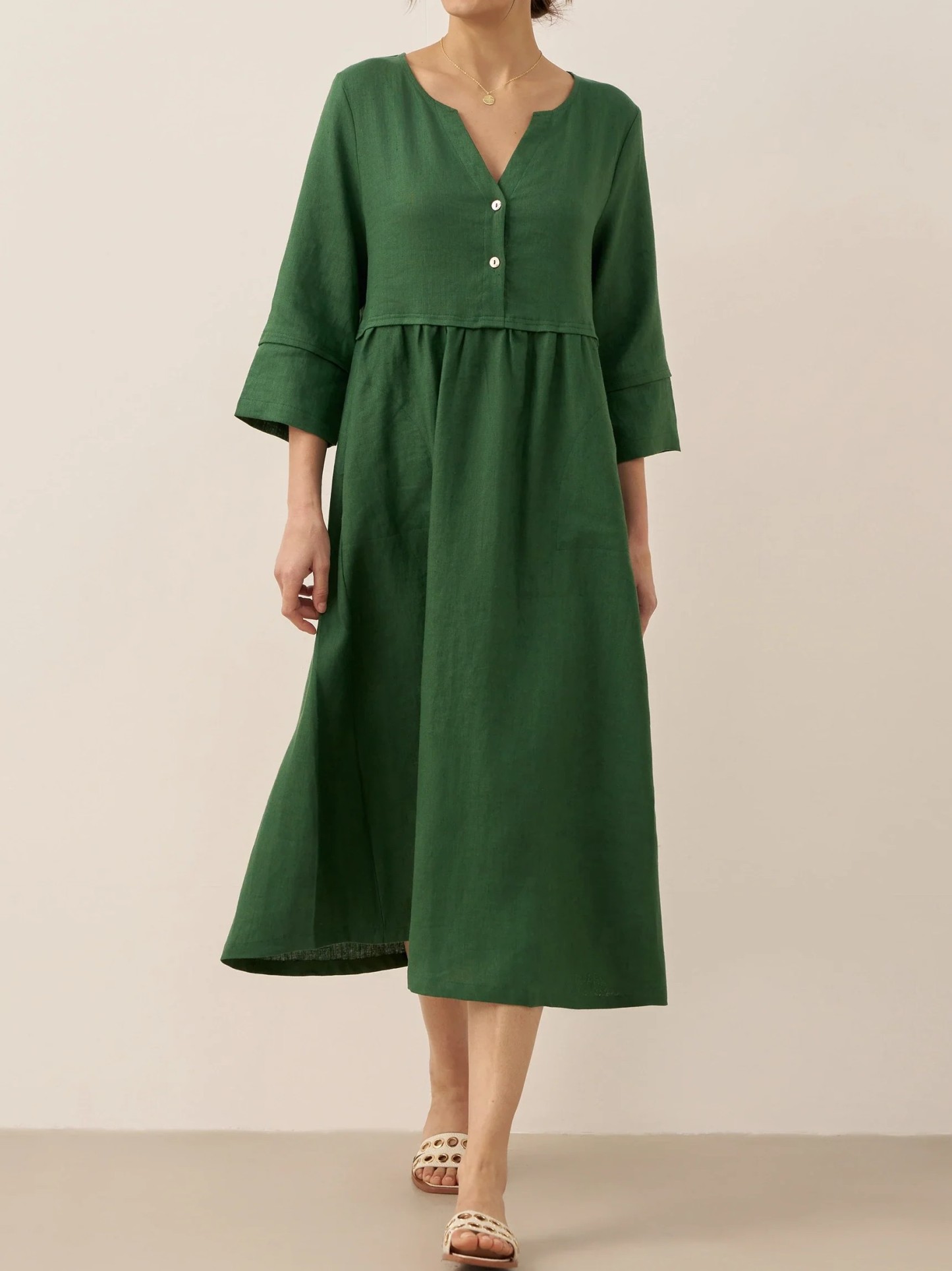 Women's Vintage Green V-neck Casual Button Three-quarter Sleeve Dresses