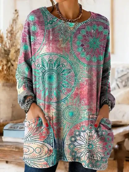 Women's Vintage Mandala Pattern Art Print Casual Long-sleeved Crew Neck Pocket Washed Cotton Denim T-shirt