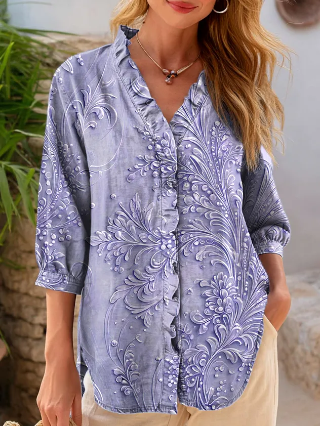 Women's Vintage Purple Textured Floral Art Print Casual Ruffle Denim Cotton Shirt