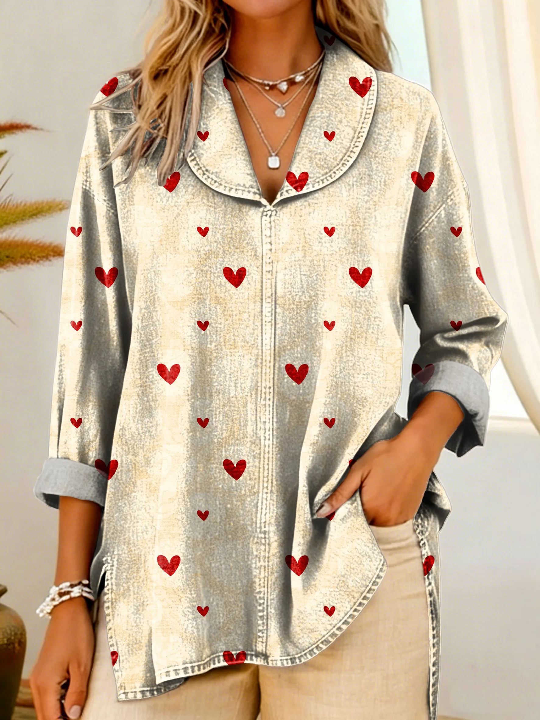 Women's Vintage Valentine's Day Yellow Love Art Print Casual Lapel Long Sleeve Denim Cotton Shirt