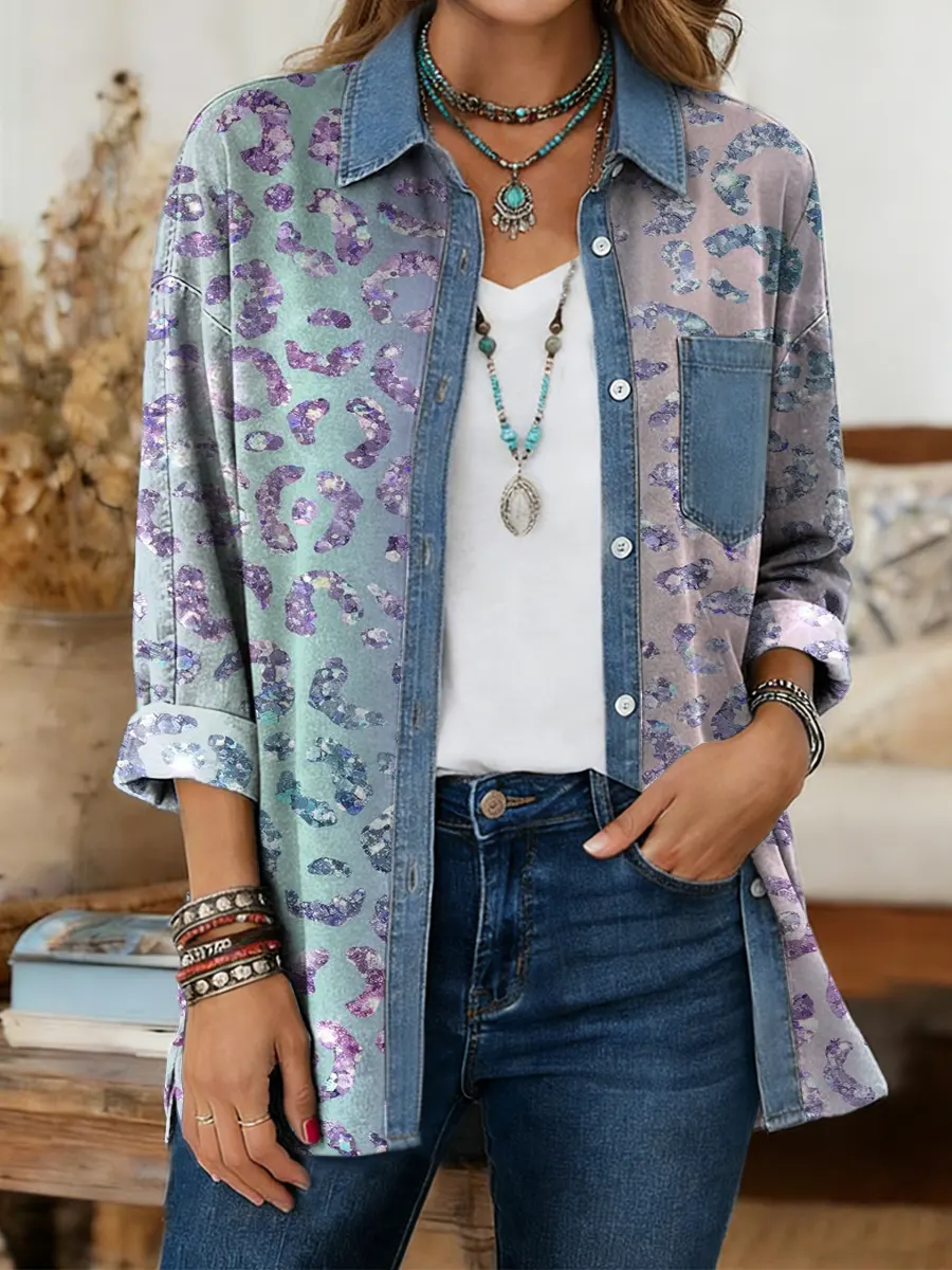 Women's Vintage Floral Print Artistic Long-sleeve Tank Top In Washed Cotton Denim