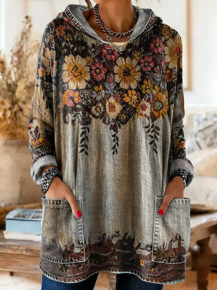 Women's Vintage Ethnic Floral Pattern Art Print Hooded Long Sleeve with Pockets