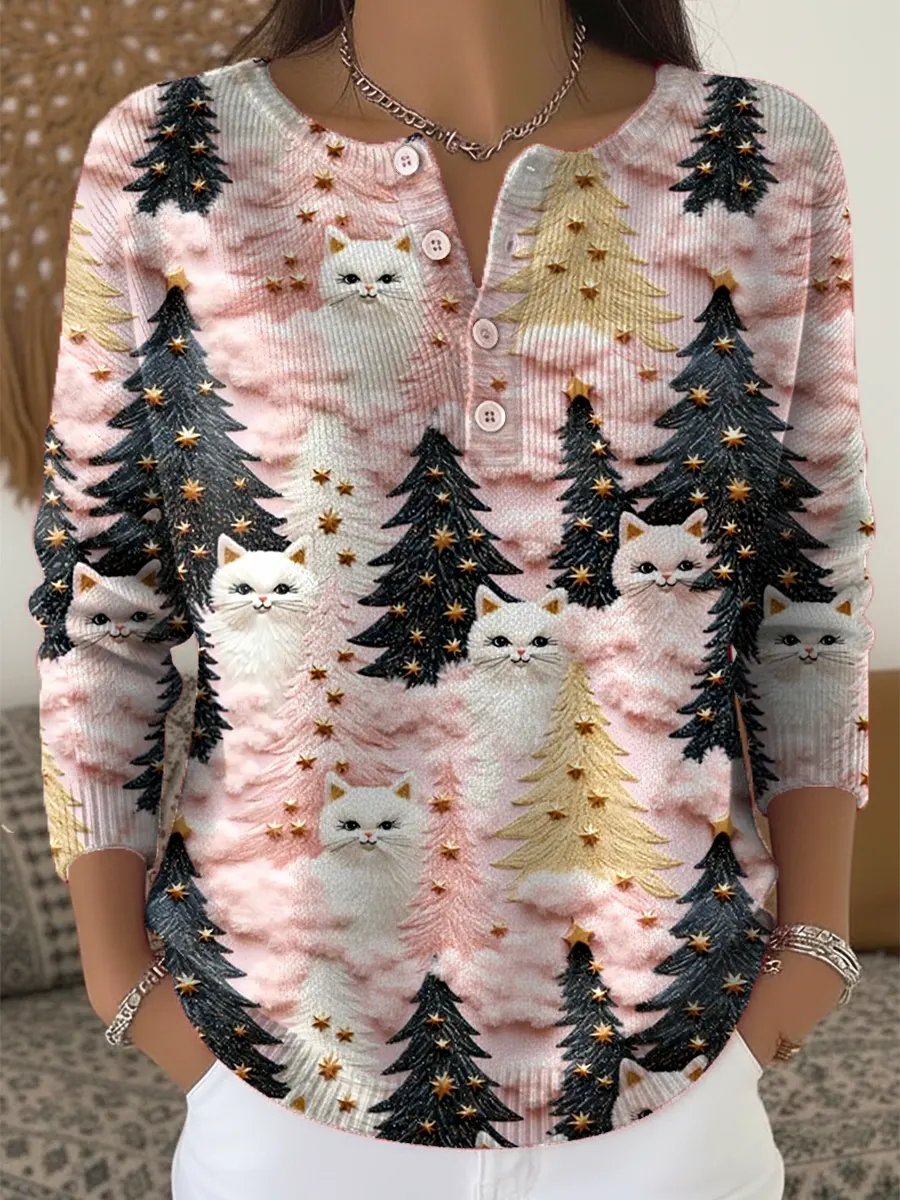 Christmas Tree Cats Print Buttoned Cardigan Sweater
