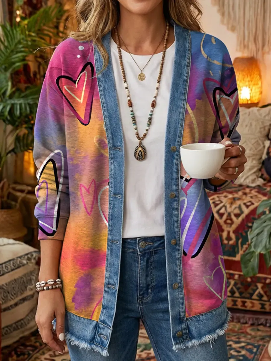 Ethnicity Colorful Love Geometry Women's Art Print Casual Long Sleeve Denim Patchwork Shirt Coat