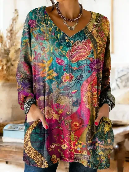 Ethnicity Colorful Retro Flowers Women's Art Print Casual Pocket Washed Denim Cotton Top