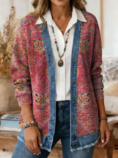 Vintage National Flower Women's Art Print Casual Denim Patchwork Knit Sweater Coat