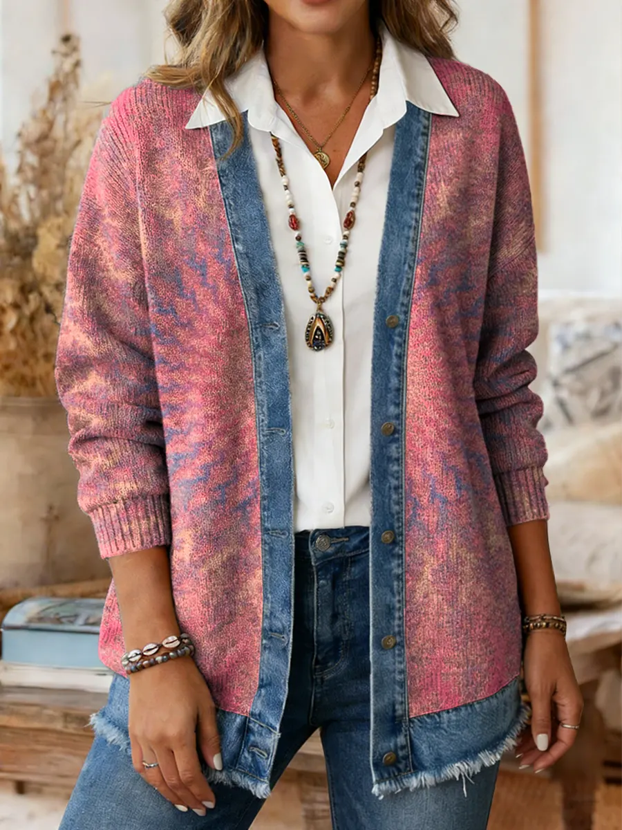 Vintage National Kaleidoscope Women's Art Print Casual Denim Patchwork Knit Sweater Coat