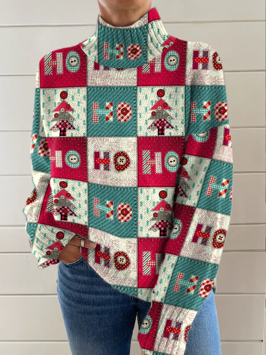Woman's Christmas Vintage Art Print Knit Turtleneck Pullover Sweater