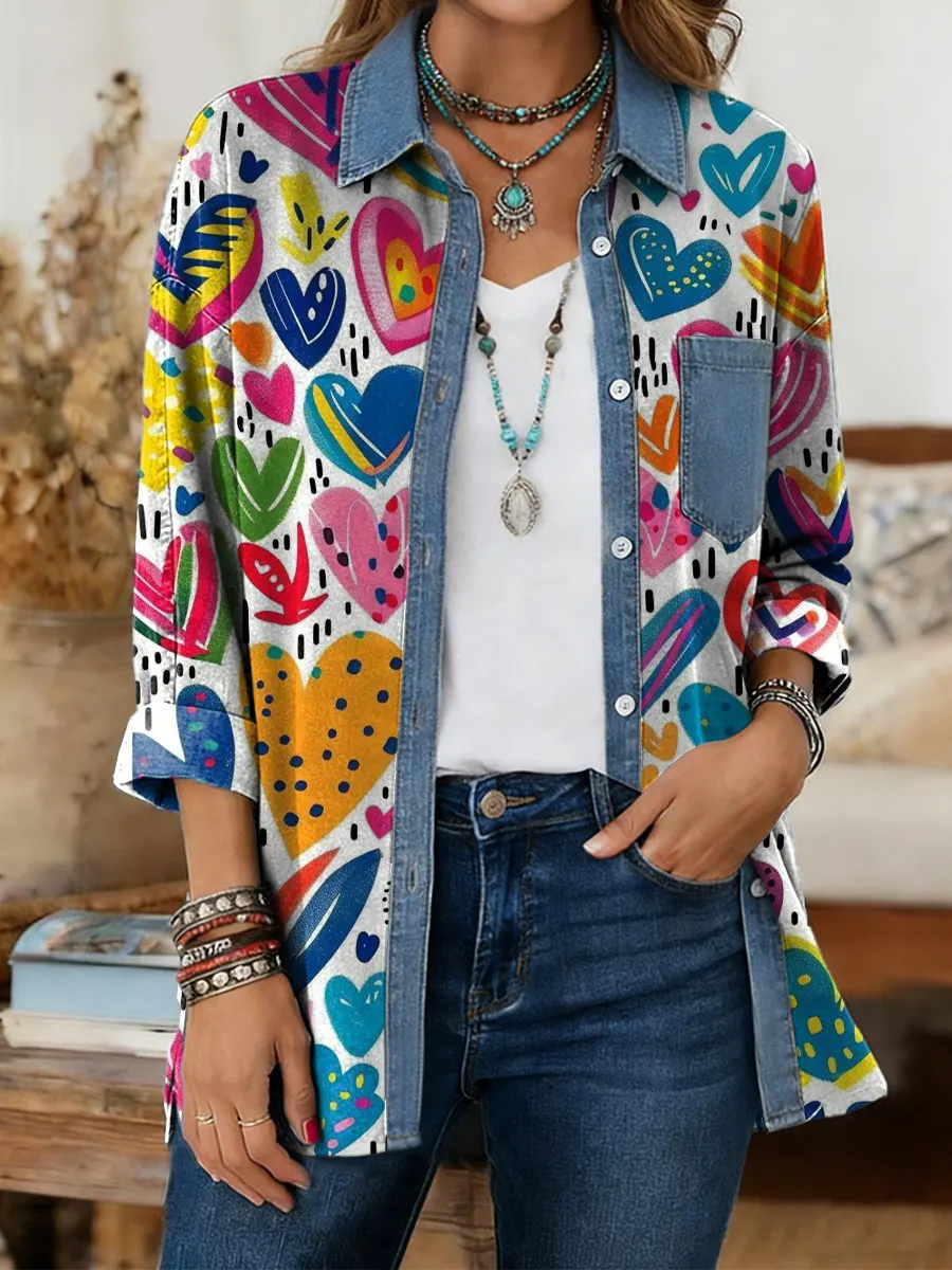 Women's Colorful Graffiti Floral Art Print Casual Denim Patchwork Cotton Shirt