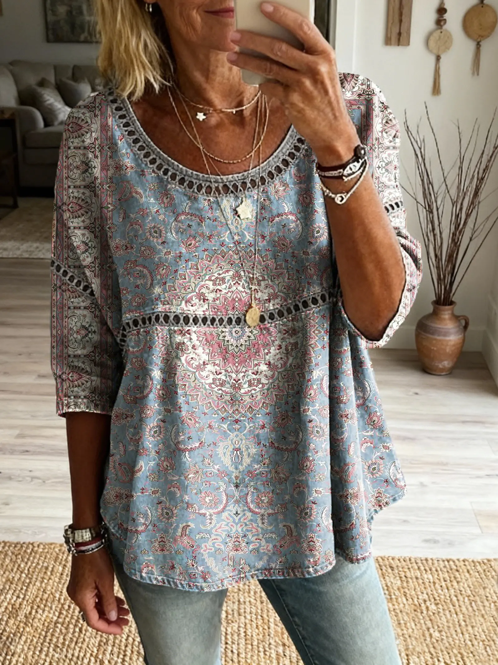 Women's Ethnic Pattern Art Print Casual Round Neck Lace-up Top