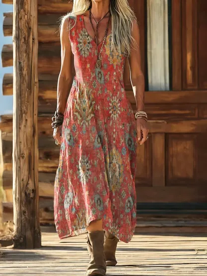 Women's Ethnic Totem Art Print Sleeveless Pocket Cotton Dress