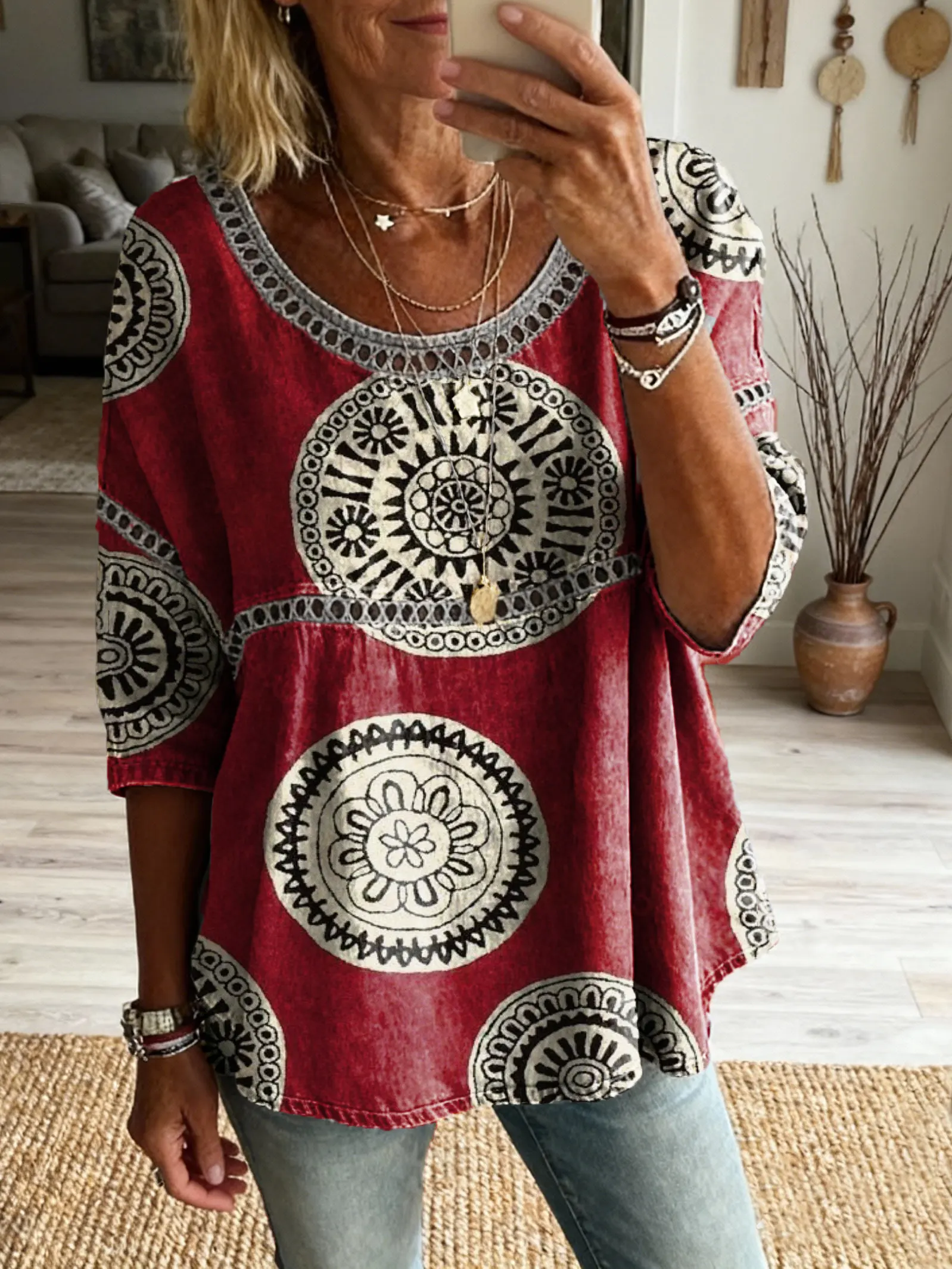 Women's Floral Pattern Art Print Casual Round Neck Lace-up Top