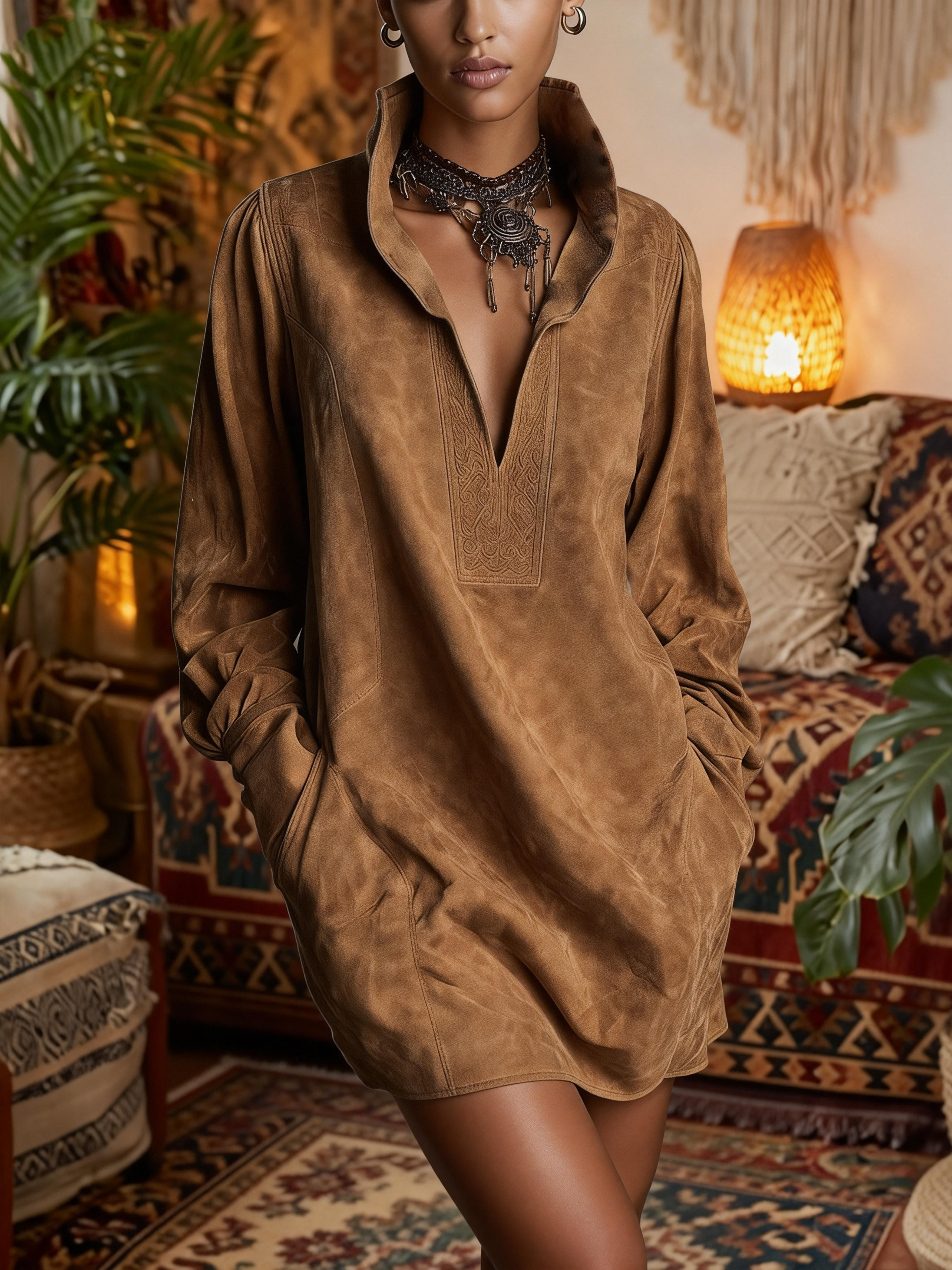 Women's Retro Art Casual Long Sleeve Stand Collar Dress