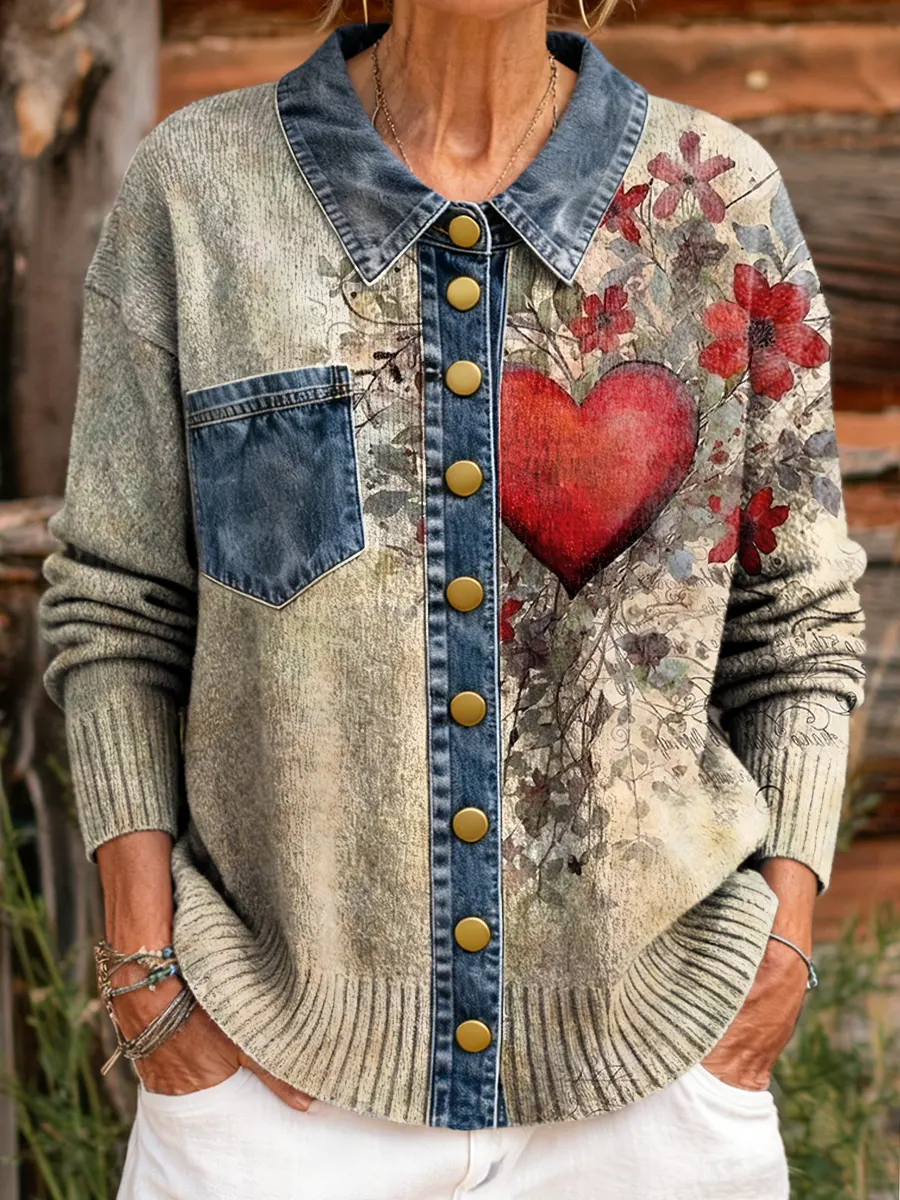 Women's Retro Heart Floral Art Print Comfortable Denim Patchwork Knit Sweater