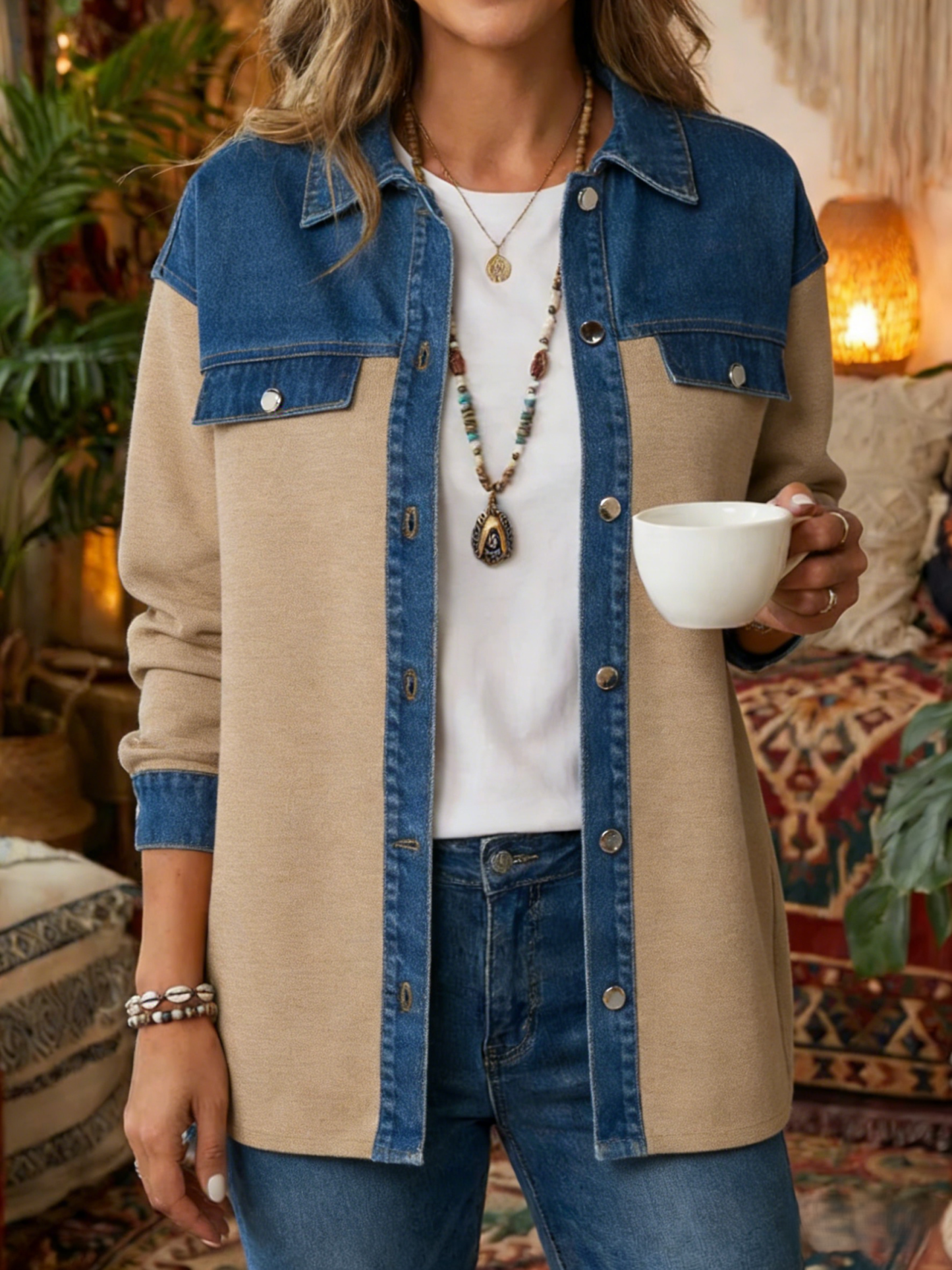 Women's Vintage Blue Lapel Casual Button Cowboy Patchwork Long Sleeve Shirt