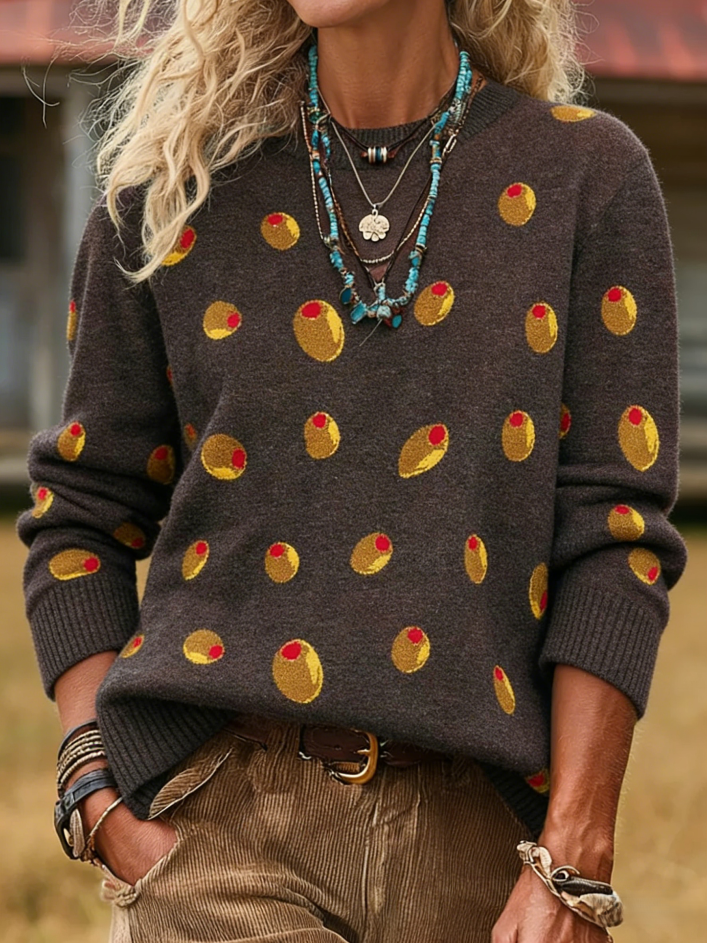Women's Vintage Dark Brown Cute Olive Casual Round Neck Long Sleeve Knit Sweater