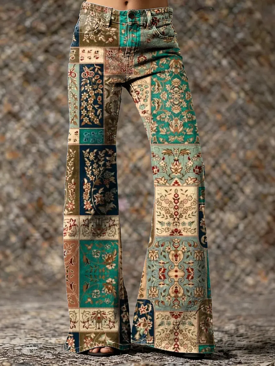 Women's Vintage Ethnic Floral Print Artistic Washed Denim Jeans