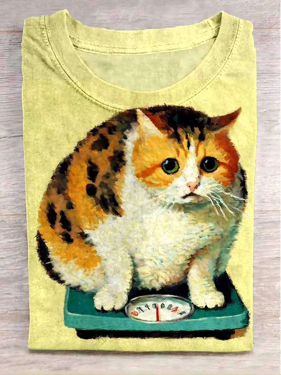 Fun Weigh Cat Print Crew Neck Short Sleeve T-Shirt