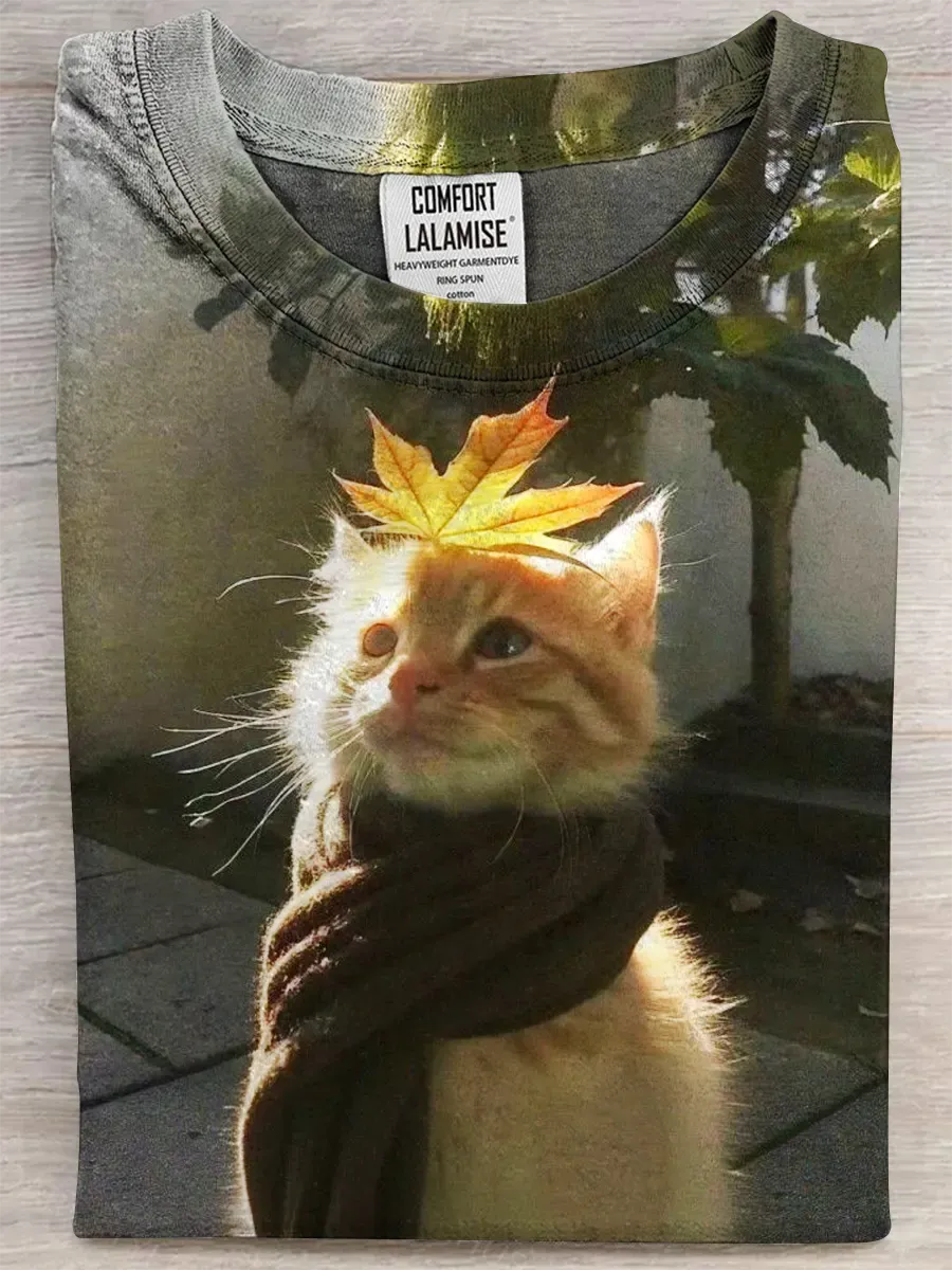 Retro Cat Fun Art Print Casual Pure Cotton Short Sleeved T-shirt