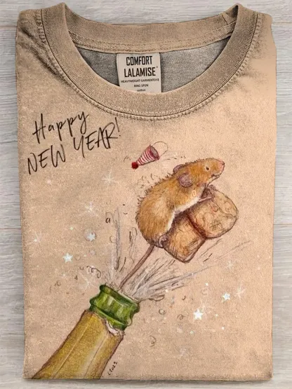 Retro Happy New Year Fun Art Print Casual Pure Cotton Short Sleeved T-shirt