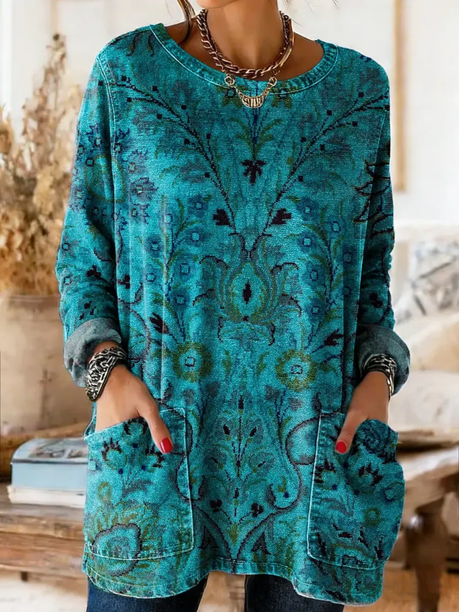 Ethnicity Geometry Flowers Totem Women's Casual Long-sleeve Crew Neck Pocket Washed Cotton Denim T-shirt