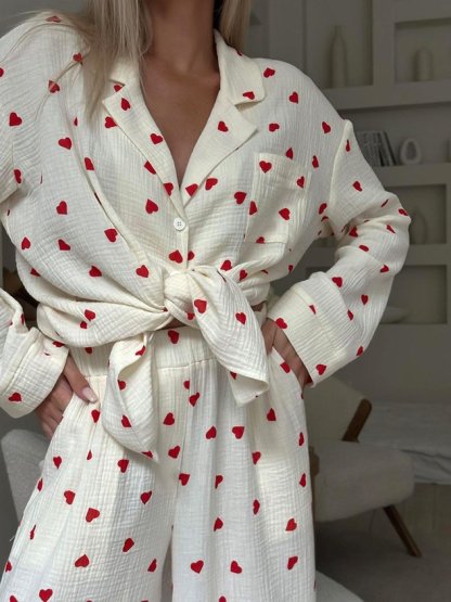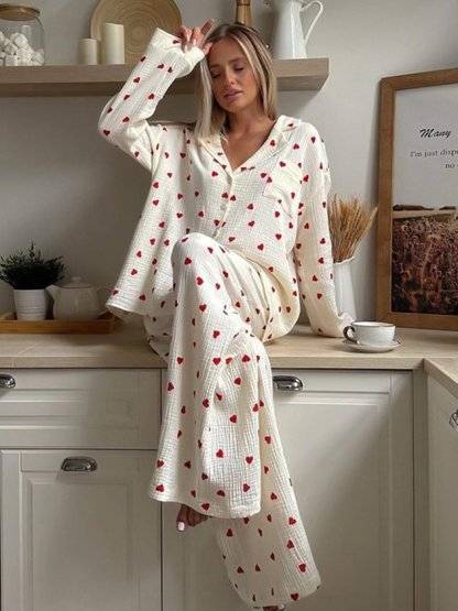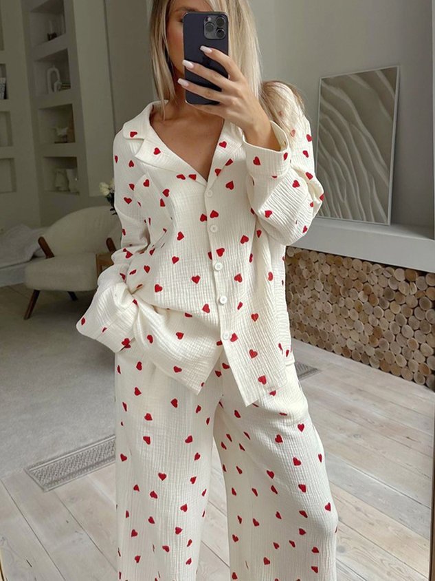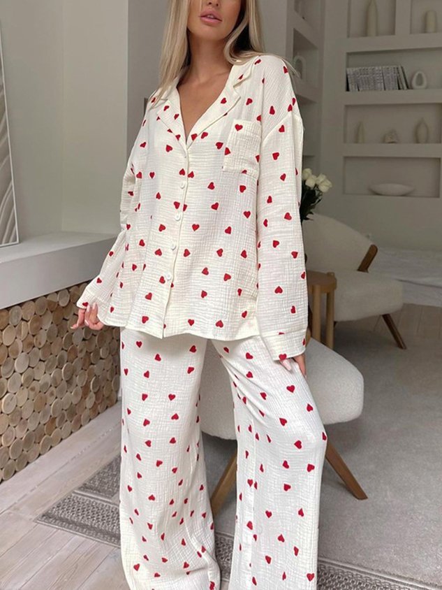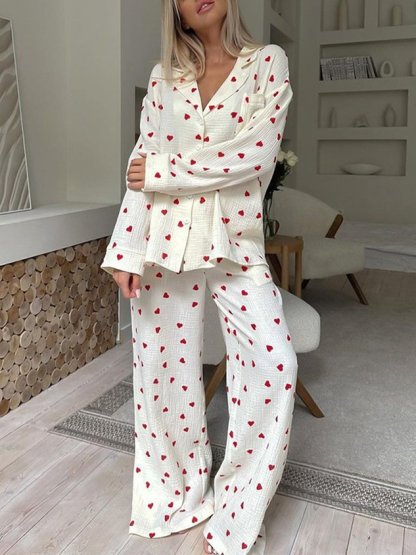 Heart Print Long Sleeve shirt and Pants Casual Pajama Set