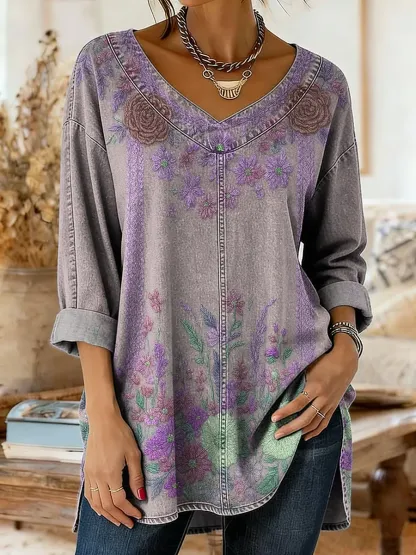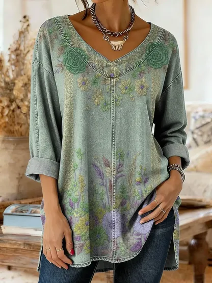 Retro Ethnic Floral Pattern Art Print Casual Washed Denim Cotton Top