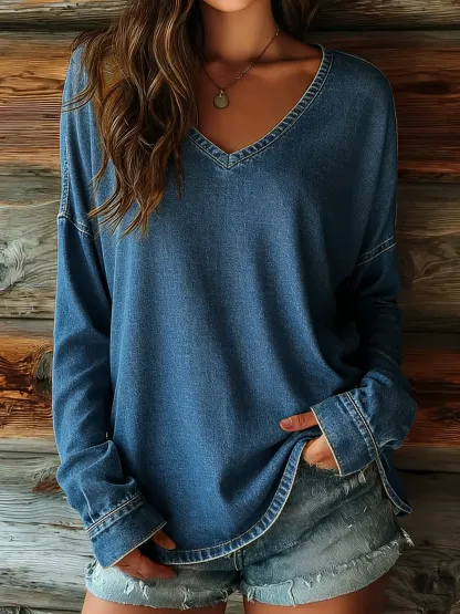 Women's Comfortable Casual V-neck Long-sleeved Cotton Denim Top