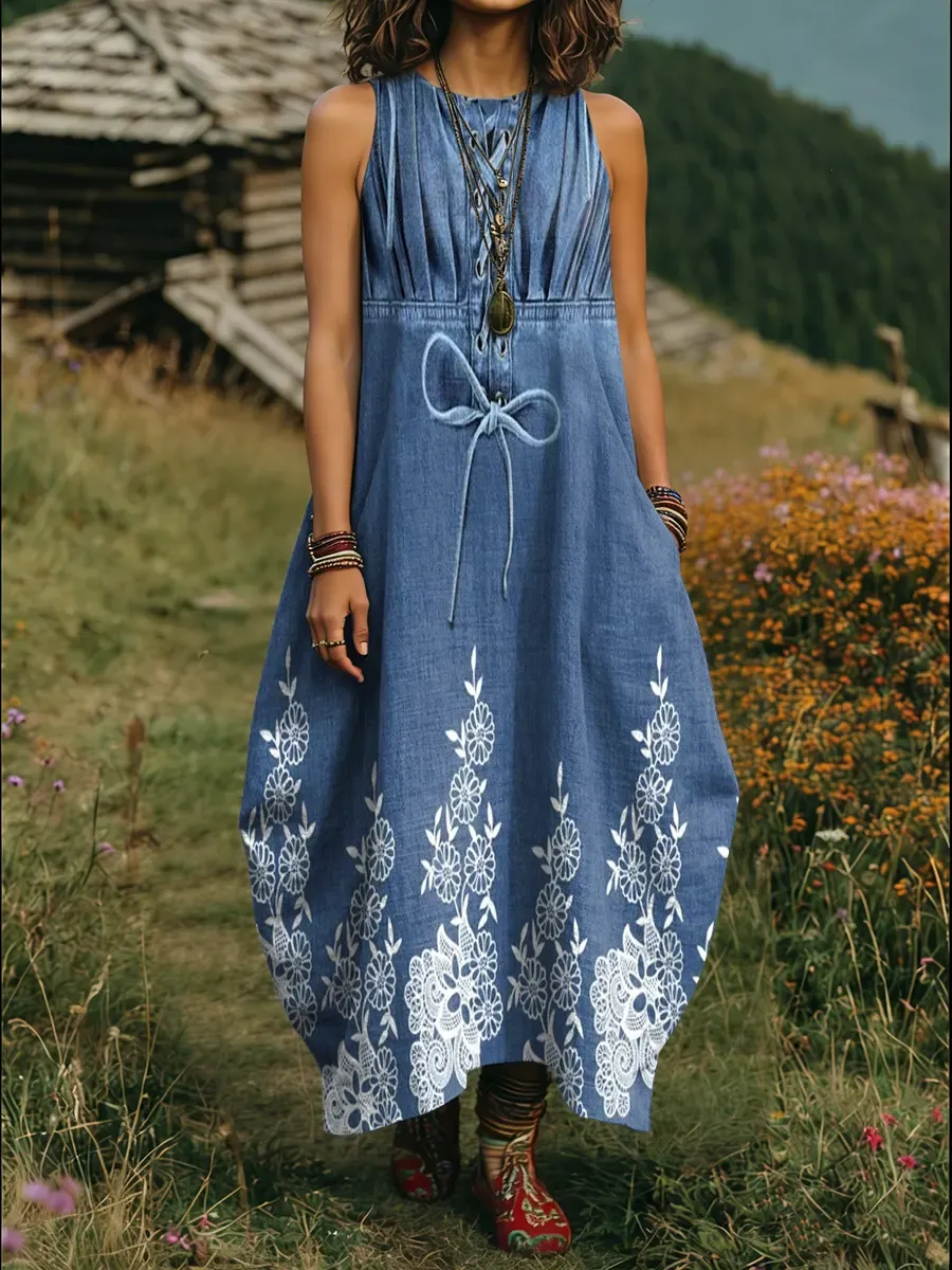 Women's Floral Art Print Round Neck Sleeveless Cotton Pocket Dress